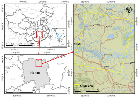 The Dongting Lake wetland, located in central-south China, is a part of the Yangtze River basin. There are two national nature reserves (i.e., Xi Dongting Lake (Mupinghu) nature reserve and east Dongting Lake nature reserve) in the Dongting Lake wetland. As the second largest freshwater lake wetland in China, the Dongting Lake wetland plays a significant role in local ecology protection and economic development. In this research, the east Dongting Lake wetland (Latitude/Longitude: 28°59′ N to 29°38′ N, 112°43′ E to 113°15′ E, 12,000 km2) was selected as the study area (Figure 1). This region has the subtropical monsoon climate with an annual precipitation of 1300 mm and an average temperature of 17 °C. The wetland area is a sedimentary plain with an elevation of 20–45 m. It is composed of fluvial and lacustrine deposits, estuarine deltas as well as outer lakes.