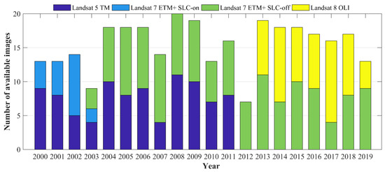 The acquisition time of Landsat images is from 1 January 2000 to 1 January 2012 (Landsat 5 TM), 1 January 2000 to 31 December 2019 (Landsat 7 ETM +) and 1 April 2013 to 31 December 2019 (Landsat 8 OLI). A total of 370 Landsat images were acquired, including 93 Landsat 5 images, 20 Landsat 7 SLC-on images, 137 Landsat 7 SLC-off images and 60 Landsat 8 images. The acquisition time of these images is shown in Figure 2. The preprocessing steps of the Landsat TOA reflectance images include: (1) convert TOA reflectance data to surface reflectance via radiometric calibration and FLAASH atmospheric correction, (2) generate monthly Landsat images using simple synthesis algorithm and quality bands of the Landsat image acquisition [49], (3) detect and mask the remaining cloudy area in monthly Landsat images using the Fmask algorithm [50], (4) calculate NDVI using the B3 and B4 bands of Landsat TM/ETM + sensor and the B4 and B5 of Landsat OLI sensor, (5) clip images using the study area vector.