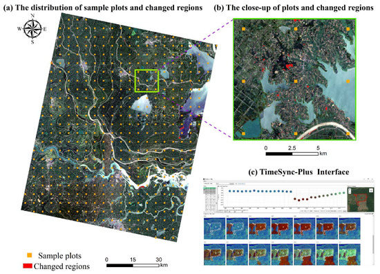 The reference data generated from both Landsat and Google Earth images by the TimeSync-Plus software. (a) The Landsat image (RGB = Band 4, Band 3, and Band 2) with 420 sample plots and forestland changes over the study area in 2018, (b) the zoom-in of the green square area in figure a, (c) the TimeSync-Plus v4.6 interface.