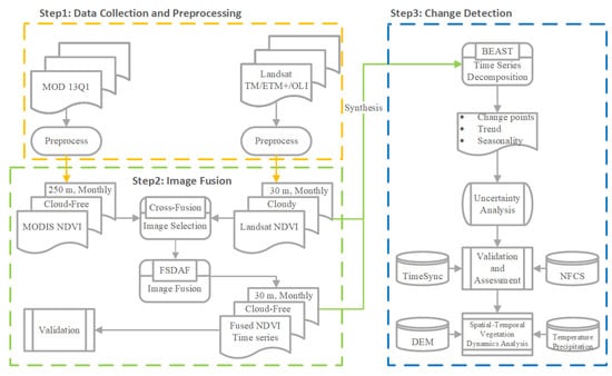 This research attempts to propose a strategy for the long-term monitoring of the wetland ecosystem and detecting the abrupt wetland vegetation changes under global warming using the fused observations. The method consists of three main steps: (1) collecting and preprocessing raw Landsat and MODIS observations of the period 2000–2019 to predict high spatial and temporal resolution time series; (2) blending Landsat and MODIS NDVI images to obtain the monthly cloud-free fused time series (30-m resolution) over the study area using the FSDAF algorithm; (3) using the BEAST method to decompose the NDVI time series, trend and seasonality of wetland vegetation over the east Dongting Lake, before analyzing the vegetation dynamics from the aspects of duration, distribution, elevation and climate. The flowchart of the proposed approach is shown in Figure 4.