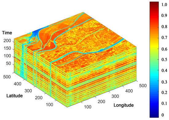 The base image pairs for each month of the last 20 years were selected as candidates to fuse NDVI images by the FSDAF algorithm. The fused NDVI images were used to fill the missing pixels or replace the contaminated pixels of the original Landsat data, but they are not directly utilized for time-series analysis. On one hand, this filling process ensured the best consistency between the derived and the actual data. On the other hand, fusion was only performed in the assigned region (cloudy and bad pixels), which saves the time of FSDAF fusion. Consequently, the final synthetic NDVI image ought to have higher accuracy and quality than the fused image. To avoid confusion, the fusion results were termed as fused images and the final synthetic images were referred to as reconstructed images. The 3D volumetric view of the fused NDVI time series stack in a sub-region of the study area in the past 20 years is shown in Figure 5. The fused image has abundant visual characteristics and details in the heterogeneous region.