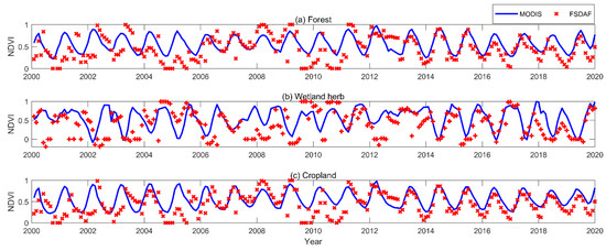 The MODIS and FSDAF NDVI time series data of (a) forest, (b) wetland herb and (c) cropland.