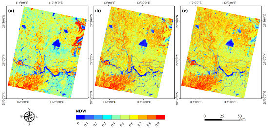 The monthly NDVI data covering the whole study area in December, 2017: (a) MODIS; (b) Landsat; (c) FSDAF.