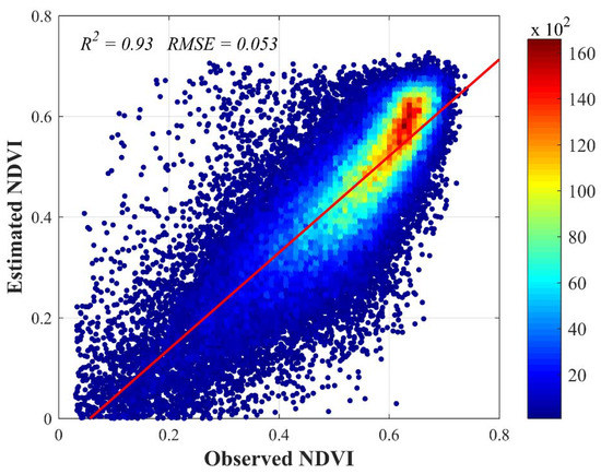 Besides, MODIS and Landsat NDVI images in December 2017 were used to assess the fusion accuracy on the corresponding dates (Figure 7). The fused dense NDVI stack preserves a same spatial resolution with Landsat images and a temporal resolution of one month. Generally, the fusion data show a close correspondence with the actual NDVI image and possess the resembling spatial characteristics of Landsat NDVI. The correlation analysis was also performed between the fused and actual Landsat NDVI in December 2017. As shown in the scatter density plot of Figure 8, high correlation (p < 0.001, RMSE (Root Mean Squared Error) = 0.053, R2 = 0.93) between the fused and actual NDVI was achieved, despite the land cover change occurred between the base and predicted dates. The results demonstrate that the cross-fusion and the FSDAF method can capture the differences between the base and predicted dates and estimate the interpolated NDVI time series. Therefore, they can be used in the following change detection.