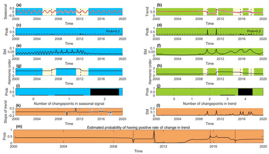Figure 9 shows an example of an NDVI time-series decomposition in a forest stand. In this example, the BEAST algorithm has detected two seasonal changepoints (Figure 9a) and four trend changepoints (Figure 9b) with the 95% credible interval of occurrence time, which possibly demonstrates the unstable characteristics of forest growth. The probabilities of both the seasonal and trend change points were estimated using the BMA strategy. The threshold of the probability of abrupt changes can be controlled manually to determine the location of change points according to the prior knowledge. BEAST is beneficial from repeating sampling (10,000 times in this experiment) and the BMA method. The standard deviations of fitting in BEAST can be controlled by the BMA strategy (Figure 9e,f). In other words, BEAST improves the accuracy and stability of fitting in seasonality and trend. Figure 9g,h show the estimated harmonic order for fitting seasonal and trend signals, respectively. In Figure 9i,j, the probabilities distribution of seasonal and trend change points are present. In order to understand the evolution of wetland vegetation during the last two decades, the slope of trend with the 95% confident interval and its standard deviations (Std) were measured (Figure 9k,l). Figure 9m depicts the probability of having a positive rate of change in trend that assists in identifying the disturbance types (e.g., deforestation and recovery).
