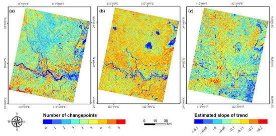 The total number of seasonal and trend changepoints, and the slope of trend during the period 2000–2019 over the study area measured by the BEAST. (a) the total number of seasonal changepoints, (b) the total number of the changepoints in trend, (c) the average of estimated slope of trend (unit: 20 a−1).