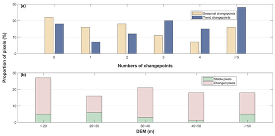 (a) The proportion (%) of seasonal- and trend-changed pixels with single/multiple times abrupt change(s), (b) the proportion (%) of stable and changed pixels for each DEM range.