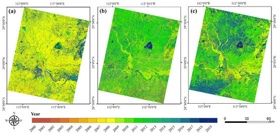 The spatial and temporal variation of the Dongting Lake wetland during 2000–2019. (a) and (b) give the time of the most significant seasonal/trend disturbance detected by BEAST; (c) is the year of the maximum NDVI of Dongting Lake wetland vegetation during the last 20 years.