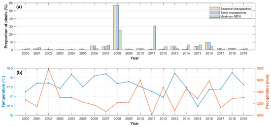 (a) Annual proportion (%) of pixels with the maximum NDVI value and the most significant seasonal and trend changes. (b) the annual average temperature (°C) and precipitation (mm) in the study area.