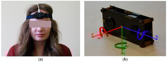 (a) Placement of the inertial measurement unit on the user’s head; (b) DUO MLX Stereo System equipped with inertial sensors with marked coordinate axes Ox, Oy, and Oz, and angular velocities ωα, ωβ, and ωγ.
