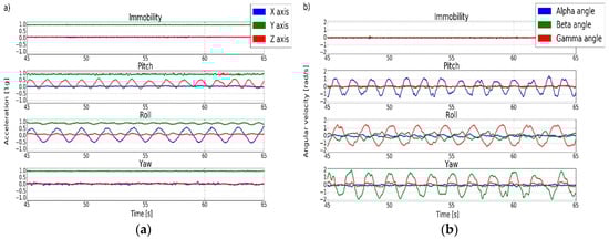 - The learning dataset recorded from a randomly selected 53, i.e., approx. 80% of all the 65 trial participants. Signals that were used as the learning set were recorded as follows: 10 s immobility—2.5 min of a specific motion type—10 s immobility, the type of gestures performed by test participants were: yaw, roll, pitch, and immobility. The collection of the learning signals therefore consisted of 53 × 4 = 212 recordings.