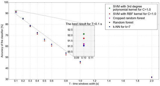Interestingly (as illustrated in Figure 4), the best results were obtained for the shortest time window, i.e., T = 0.1 s window containing 10 signal samples. An increase in the width of the time window negatively affected the classification accuracy. Note that for the test dataset, regardless of the width of the time window, the best classifier was the SVM with a 3rd degree polynomial kernel (accuracy better than 92%). The best classification accuracy for the k-NN classifier was obtained for k = 7 and was slightly worse than the one achieved by the random forest classifier (both with an accuracy above 91%).