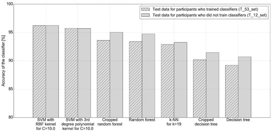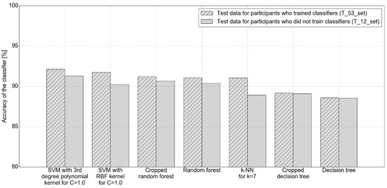 Comparison of the classifiers’ accuracy obtained for the test data from participants who trained classifiers on the T_53_set and the test data from individuals who did not record the training data (T_12_set). Classifiers accuracy for the test data—causal system (vectors with 42 parameters).