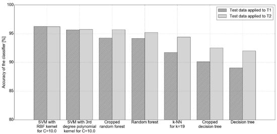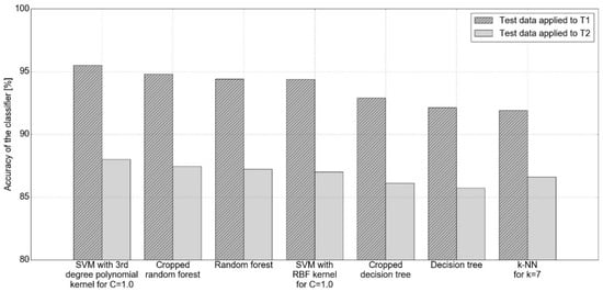 We also verified how the classifiers’ accuracy depends on the type of testing scenario as defined in Section 2.1. For the causal system, the best results were obtained for test scenario T1 (see Figure 7). The accuracy of all classifiers exceeded 90%. The results obtained for test scenario T2 were distinctly inferior. For this testing scenario, the accuracy of the classifiers was below 90%. Again, the best classifiers were the SVM and the random forests.