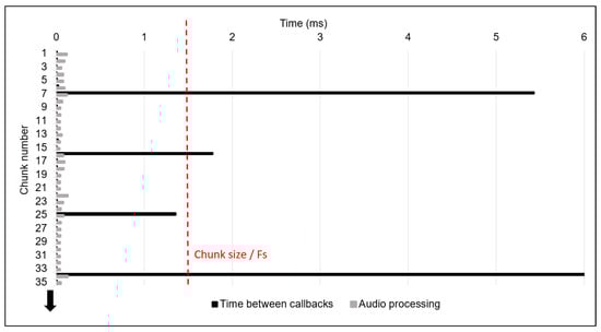 Furthermore, Table 3 in the last row reports the percentage of violations of the real-time limit, measured as the time between two subsequent callbacks (idle time). Because no buffer underflow and consequent sound artifacts occur in consequence of such violations, certainly the system alternated audio chunks preemption with prioritization of non real-time processes. In fact, portaudio creates a further buffering level hence smoothing out delays due to algorithmic and/or OS bottlenecks, at the cost of introducing additional latency—about 50 ms in our tests. Figure 2 shows that, in practice, few longer delays interleaved with several short idle times. Such delays happen when the Python process waits for the next chunk of samples to become available from the audio driver.