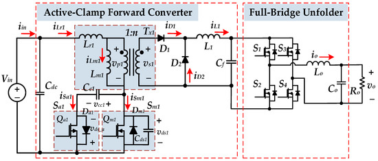 The circuit diagram of the proposed inverter is shown in Figure 4. The active-clamp forward converter with zero voltage switching is used to generate the single-polarity rectified sine wave, and the full-bridge unfolding circuit with line-frequency switching switches the output polarity. The power stage of the active-clamp forward converter mainly consists of the main power switch Sm1 (including MOSFET Qm1, body diode Dm1, and parasitic capacitor Cds1), the real transformer Tx1 (including magnetizing inductor Lm1 and ideal transformer with turn ratio 1:n), the forward diode D1, the freewheel diode D2, the inductor L1, and the output capacitor Cf. The auxiliary switch Sa1 (including MOSFET Qa1 and body diode Da1) and the clamp capacitor Cc1 are used for resetting the residual magnetic flux of the transformer. The energy of the magnetizing inductor Lm1 and the clamp capacitor Cc1 are alternately transferred. Except for effectively recovering the energy of residual magnetic to the input power source, both the switches Sm1 and Sa1 can achieve ZVS characteristics to reduce switching losses. In addition, the full-bridge unfolding circuit consists of the power switches S1, S2, S3 and S4, and the output filter is formed of the inductor Lo and the capacitor Co. The power switches S1, S2, S3 and S4 are only switching with line frequency, so that there is almost no switching loss.