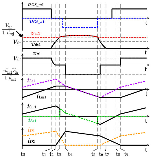 The on-time of the main switch Sm1 is dm1Ts, and the on-time of the auxiliary switch Sa1 is (1 − dm1) Ts, where Ts is the high-frequency switching period. Assuming that the inverter operates in continuous conduction mode (CCM), when the main switch Sm1 is turned on and the auxiliary switch Sa1 is turned off, the voltage vp1 across the transformer magnetizing inductance is equal to the input voltage Vin and expressed as: