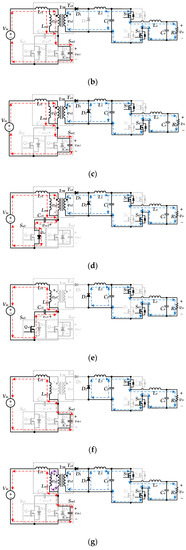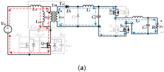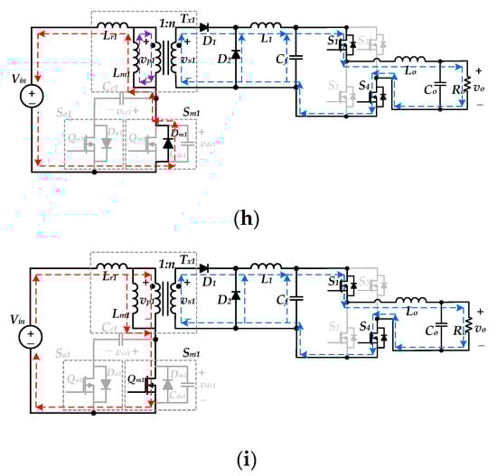 where , and . Since the direction of the current iLr1 cannot be changed instantaneously, the anti-parallel diode Dm1 is forced to turn on, and the energy is recovered to the input. In order for the main switch Sm1 to have the ZVS characteristic, Equation (23) should satisfy before this state ends. The following conditions can be obtained: