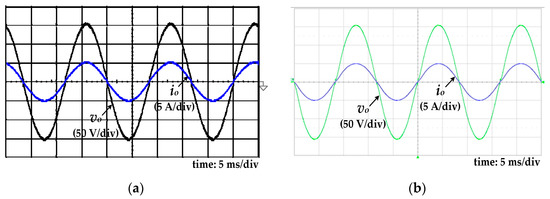 The proposed active-clamp forward inverter is driven by SPWM signals. Figure 9a,b are the simulation and measured waveforms of the output voltage vo and output current io when the inverter is operated at 48 V input voltage, and Figure 9c,d are the simulation and measured waveforms of the output voltage vo and output inductor current iL1. It can be seen from the figures that the output voltage and current are in the form of a sine wave with low distortion, which proves that this isolated inverter can effectively convert the DC voltage into an AC output. Furthermore, Figure 10 shows the measured waveforms of the output voltage vo and output current io when the inverter operates with the step load change between 320 W and 160 W. As can be seen, the output voltage can be quickly and stably regulated to a sine wave of 110 Vrms, proving that the proposed inverter has good dynamic voltage regulation capability. In addition, the line regulation is 1.26%, and the load regulation is 0.78%, which meets the general specifications of ±3%.