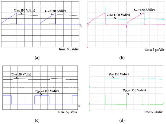 (a) Simulation waveforms of vds1 and ism1, (b) measured waveforms of vds1 and ism1, (c) simulation waveforms of vcc1 and vGS_m1, and (d) measured waveforms of vcc1 and vGS_m1, when the inverter is operated at the full load of 400 W.
