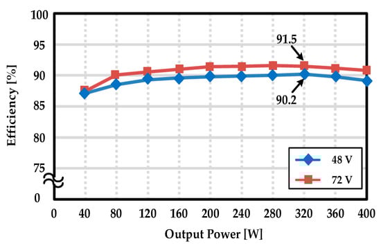- Conversion efficiencyAccording to the efficiency curve shown in Figure 12, the efficiency of the active-clamp forward inverter is up to 90.2% at 48 V input and 400 W output power. The measured efficiency of the forward inverter in Reference [20] is 89.5% at 45 V input and 110 W. Besides, the measured efficiency of the dual-switch forward inverter in Reference [21] is only 82% at full load. Therefore, it can be concluded that the proposed inverter has better conversion efficiency than other forward inverters.