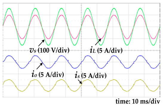 Measured waveforms of the load current iL, the inverter output current io, utility-line current is and utility-line voltage vs. during grid-connection operation.