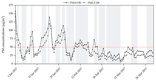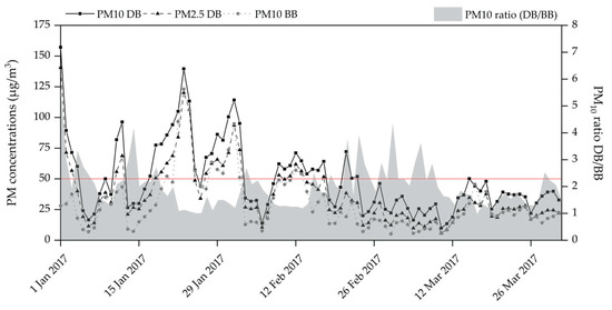 Figure 2 combines the daily PM concentrations at the urban sampling site DB and the background site BB. As expected, lower PM10 concentrations, ranging between 5.1 and 123 µg/m3, were observed at the background site BB. Nevertheless, individual days with high PM10 concentrations emerge in the BB record. These periods of relatively similar PM concentrations at DB and BB have been considered as indicative for pollution episodes affecting an overall wider area.