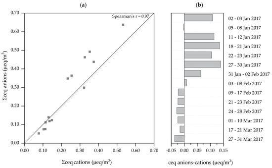(a) Ion balance of pooled PM2.5 samples at the monitoring station located in Graz Don Bosco (DB), 2 January–31 March 2017. (b) Temporal variations of ion balances for individual sampling pools.