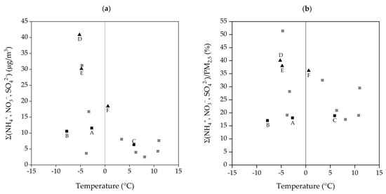 (a) Temperature dependence of mass concentrations and (b) relative contributions of major ions (nitrate, ammonium, sulfate) to PM2.5 samples at the urban sampling site in Graz DB, 2 January–31 March 2017. Black highlighted squares mark time periods with DB/BB PM10 ratios > 2 (A: 2 January–3 January 2017; B: 11 January–12 January 2017; C: 21 February–23 February 2017). Black highlighted triangles mark time periods with DB/BB PM10 ratios ≤ 1.5 (D: 22 January–23 January 2017; E: 31 January–2 February 2017 and F: 9 February–17 February 2017). Remaining data points are shown by grey squares.