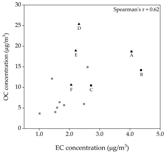 Scatterplot between organic carbon (OC) and elemental carbon (EC) concentrations in PM2.5 samples at the urban sampling site in Graz DB, 2 January–31 March 2017. Black highlighted squares mark time periods with DB/BB PM10 ratios > 2 (A: 2 January–3 January 2017; B: 11 January–12 January 2017; C: 21 February–23 February 2017). Black highlighted triangles mark time periods with DB/BB PM10 ratios ≤ 1.5 (D: 22 January–23 January 2017; E: 31 January–2 February 2017 and F: 9 February–17 February 2017). Remaining data points are shown by grey squares.