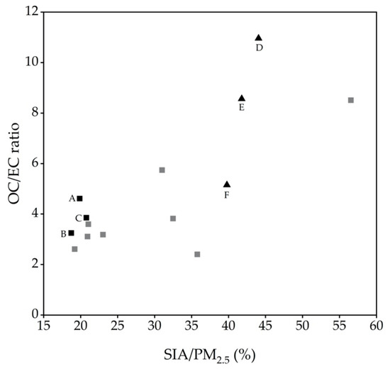 Correlation between OC/EC ratio and the contribution of secondary inorganic aerosols (SIA) to PM2.5 at the urban sampling site in Graz DB, 2 January–31 March 2017. Black highlighted squares mark time periods with DB/BB PM10 ratios > 2 (A: 2 January–3 January 2017; B: 11 January–12 January 2017; C: 21 February–23 February 2017). Black highlighted triangles mark time periods with DB/BB PM10 ratios ≤ 1.5 (D: 22 January–23 January 2017; E: 31 January–2 February 2017 and F: 9 February–17 February 2017). Remaining data points are shown by grey squares.