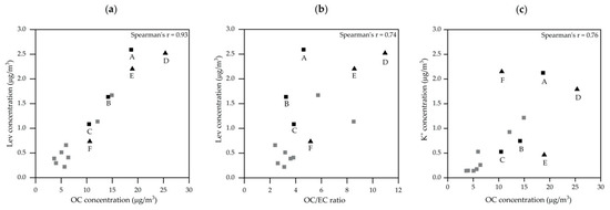 (a–c). Correlation between levoglucosan (Lev), OC, and K+ concentrations in PM2.5 samples at the urban sampling site in Graz DB, 2 January–31 March 2017. Black highlighted squares mark time periods with DB/BB PM10 ratios > 2 (A: 2 January–3 January 2017; B: 11 January–12 January 2017; C: 21 February–23 February 2017). Black highlighted triangles mark time periods with DB/BB PM10 ratios ≤ 1.5 (D: 22 January–23 January 2017; E: 31 January–2 February 2017 and F: 9 February–17 February 2017). Remaining data points are shown by grey squares.