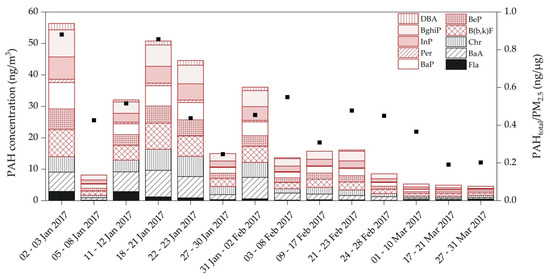 Ten PAHs including fluoranthene, benzo(a)anthracene, chrysene, benzo(b,k)fluoranthene, benzo(e)pyrene, benzo(a)pyrene, perylene, indeno(1,2,3-cd)pyrene, benzo(ghi)perylene, and dibenz(ah)anthracene were quantified for all time periods. The sum of all 10 quantified PAHs is hereinafter abbreviated as PAHtotal. Table 3 presents average PAH concentrations as well as the standard deviations, median values, and ranges for each congener associated to PM2.5 samples at Graz DB. Concentrations of benzo(a)pyrene (BaP), the primary representative of PAHs and a known carcinogen (class 1 by the International Agency for Research on Cancer (IARC) [37]), ranged between 0.51 and 8.4 ng/m3 (2.2 ng/m3). The highest concentrations of BaP was measured during 2 January–3 January 2017, a time period still showing influence of local activities at New Year’s Eve, where PAHtotal concentrations reached 102 ng/m3. PAHtotal concentrations varied from 4.6 to 56 ng/m3 (17 ng/m3) over the study period and are comparable to recent results reported for other European cities [38,39]. With proceeding time, a decreasing trend of PAHtotal concentrations was observed and highest concentrations could be observed for benzo(b,k)fluoranthene (B(b,k)F) followed by benzo(a)anthracene (BaA) and BaP.