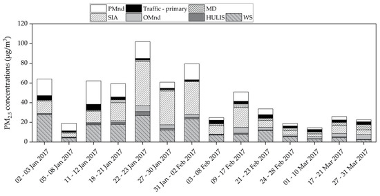 The concentrations of the PM source groups defined in Section 2.4 are shown in Figure 9. For all sample pools WS and SIA emerge as the dominant sources, although with alternating dominance. WS contributions to PM2.5 mass ranged between 10% and 43% (2.4–27.7 µg/m3) and contributions from SIA ranged between 19% and 57% (2.8–44.9 µg/m3). Contributions of ‘traffic primary’ ranged between 1.6% and 16% (1.4–6.0 µg/m3). Contributions of HULIS and MD showed rather low average contributions to PM2.5 mass of 2.3% (1.0 µg/m3) and 4.1% (2.2 µg/m3), respectively. Uncertainties in conversion factors lead to under- and over-estimations of PM sources in certain cases. However, during the study period the carbonaceous fraction was slightly overestimated (1.8 µg/m3) only between 2 January–3 January 2017 via this macro-tracer approach.