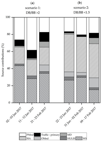 As the discussions of the chemical composition revealed marked differences between the two scenarios, source apportionment via the macro-tracer approach is shown in more detail for these samples (Figure 10). Time periods of scenario 1 (DB/BB PM10 ratios > 2; Figure 10a) showed higher average contributions of ‘traffic primary’, contributing 7–11% to PM2.5 mass (average value of 10%), while contributions of SIA ranged from 19–21% (average value of 20%). Contributions of WS ranged between 28% and 43% (average value of 35%). Furthermore, the mass of not identified PM was found quite high. During time periods of scenario 2 (DB/BB PM10 ratios ≤ 1.5; Figure 10b), SIA increased and ranged from 40–44%, even though these days were not the coldest during the study period. During this scenario the contribution of ‘traffic primary’ decreased to an average value of 4%. Contributions of WS ranged from 15–30% (average value of 20%), and thus are lower than during samples of scenario 1. The time period of 9 February–17 February 2017 shows elevated contributions of MD and also OMnd, which can be linked to an input of desert dust identified during this time period [28]. Generally speaking, MD did not show pronounced variations during either scenario considered (4% during scenario 1 and 5% during scenario 2). The same was found for HULIS, with average contributions of 2% and 3%, respectively. Contributions of OMnd were found to be higher during time periods of scenario 2 (9%) than during scenario 1 (2%).