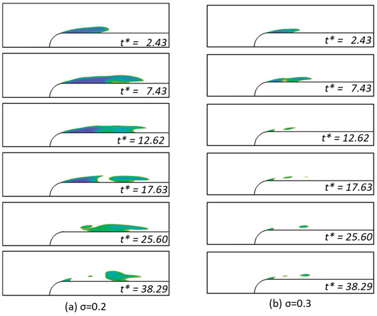 Figure 2 compares the surface pressure coefficients at various cavitation numbers in experimental results [1] and analysis. The number s/d is dimensioned by the length and diameter of the hemispherical cylinder. The surface pressure coefficient (CP) is a dimensionless difference between the pressure on the surface and the ambient flow, and is generally multiplied by −1 to the result of Equation (18). When the cavitation number determined by Equation (16) is 0.2, CP cannot be lower than −0.2, and when the value is −0.2, it can be determined that a complete cavity is formed. When the number of cavities is 0.2 and 0.3, it is shown that the process of generating and developing cavities is in good agreement when comparing the experimental results with the analysis. There are some differences at the end of the cavitation because of the increased instability caused by the re-entrant jet occurring at the end of the cavitation. This is a physical phenomenon common to experiments and computational analysis. Figure 3 shows the results of the computational analysis of natural cavitation over time. Over time, the cavitation repeats the process of creation, destruction, and regeneration. The size of the cavitation shape is larger as the cavitation number is smaller. Also, since the natural cavitation is a phase change process caused by local pressure drop, it can be confirmed that the cavitation disappears as the pressure is restored. This is a very important physical phenomenon that is distinguished from ventilated cavitation through artificial injection.