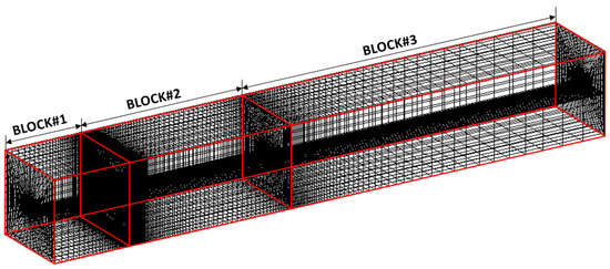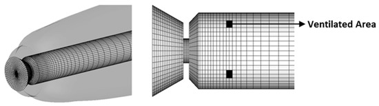 For the supercavitation flow analysis, an alignment grid with three blocks is constructed. Figure 4 shows the entire grid system. The total number of cells is about 600,000. Many cells were placed around the cavitator and body to improve the stability and accuracy of the analysis. Figure 4 and Figure 5 show length information and boundary conditions for the entire grid. In the case of the front grid of the cavitator, if sufficient length is ensured, the flow can develop well and stably. However, in this study, only 10 times the diameter of the cavitator was secured because the size of the cavitation tunnel to be compared was modeled. The rear grid also considered the size of the cavitation tunnel. The value of D/dc = 9.49 was chosen to be identical to the environment in which the blockage effect affecting the cavitation size was verified. The boundary conditions include velocity inlet conditions and pressure outlet conditions. As an experiment for ventilated cavitation, conditions that do not generate natural cavitation are required. Therefore, in the experiment and analysis, the low speed (6 m/s) and total pressure (40 kPa) conditions are maintained. In the analysis, a ventilated area with the same area as the experiment was modeled. The four ventilated areas are evenly distributed along the body diameter. The ventilated area is the velocity inlet condition equal to the inflow condition. At this time, the ventilated velocity was determined by the ventilated gas flux coefficient.