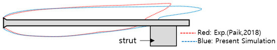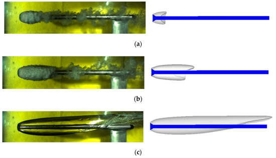 Figure 6 shows the change of cavitation shape according to the change of Cq. In the experiment and analysis, the cavitation shape was confirmed after enough time had passed while Fn and Cq were kept constant. After enough time, the cavitation shape remains almost constant for a ventilated cavitation case [13]. Fn(=) is the flow field characteristic (gravity effect) according to the inflow velocity. The results of the computational analysis indicate that Fn is 10.8, which means low-speed conditions (V∞ = 6 m/s). At this time, the shape characteristic of ventilated cavitation is asymmetric due to the buoyancy effect due to low Fn. When Fn is 10.8, it can be seen that the area of the cavitation covering the body increases as the ventilated gas flux coefficient increases, and the experimental and computational results are in good agreement. Figure 7 shows that when Fn is maintained and Cq is increased, the cavitation width and length become large. Since the increase in cavitation width is limited by the blockage effect, it can be confirmed that the length increase is relatively large. Figure 8 shows the result of comparing experiments and analysis for cavitation formation when Fn is 10.8 and Cq is 0.2. Experiment and analysis agree well except for the closing part of the cavity. This difference is the strut with and without. In the case of the experiment, there was a strut, but the analysis did not include the strut in the modeling. In the experiment, the strut inhibits the development of cavitation. In contrast, in analysis, there is no strut, so cavitation develops backward. This causes differences in the closing part of the cavitation.
