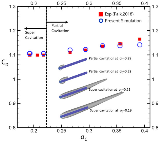 It can be seen that the results of the cavitation tunnel test and computational analysis are in good agreement. As the injection amount increases, the cavitation number decreases and approaches the supercavitation. According to the cavitation shape change from the experimental and analysis results, it can be confirmed that the supercavitation occurs when the cavitation number is below 0.23. It can be confirmed by tests and computational analysis that the CD value is maintained at a certain level when it is supercavitation. In the case of the drag, there is no change after the supercavity is achieved, but the cavitation shape changes. In Figure 10, when the cavitation number is 0.19 and 0.21, the drag coefficient values are the same, but the cavitation length is different. In the case of the partial cavitation, instability by the re-entrant jet and the influence of the strut in Figure 8 exist, so the test and the analysis are not completely consistent. When the Cq is small and cavitation number high, the instability is expected to be greater. This difference can be seen in Figure 10 when the cavitation number is the largest. In order to minimize this instability in the computational analysis, the average value when the cavitation change reached the quasi-equilibrium state was employed. Figure 11 shows the results of computational analysis of the drag change and cavitation shape over time in a state where the cavitation number reaches 0.193. In the case of computational analysis, the flow field remains stationary until the analysis begins. At the same time as the analysis begins, the inflow is given a constant velocity value without acceleration. Therefore, the initial perturbation can be regarded as meaningless data that can occur numerically. To reduce uncertainty, the average value for data after 0.2 s was used as the result value for the condition. In the case of natural cavitation, the creation and destruction of cavitation are repeated, and the re-entrant jet occurs (see Figure 3). However, when the ventilated cavitation is continuously supplied with air, the cavitation shape is almost constant after the quasi-equilibrium state. In the cavitation shape analysis result on the right of Figure 11, the dotted line connects the cavitation end change over time. After 0.2 s, which is the quasi-equilibrium state, it can be confirmed that there was little change in the length of cavitation. These results indicate that in the case of ventilated cavitation when the gas is constantly supplied, the cavitation shape is independent of the time variable. In this case, the CPU time is approximately 44 h from the start of analysis to the semi-equilibrium state (0.2 s). The total CPU time up to 0.3 s is about 65 h (Xeon E5-2640, 2.40 GHz).