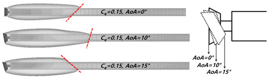 Factors that determine the maximum diameter and length of the cavitation are Fn at ambient speed and Cq and σC at the injection rate. In addition, there are angles of attack of the cavitator that can have a very large impact in real environments. In this study, we studied how the shape of cavitation changes when the cavitator has an angle of attack. Figure 12 shows the cavitation shape change according to the angle of attack of the cavitator in the injection cavitation computational analysis with the injection characteristic of Cq = 0.15.