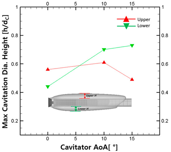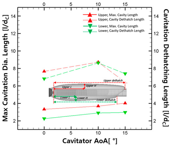 When the angle of attack (AoA) is 0°, the cavitation asymmetry due to the rise of the cavitation tail due to the gravity and buoyancy effect occurs as shown in Figure 6. If the angle of attack is 10 degrees, the cavitation generated from the cavitator is generated below the body, thereby canceling the asymmetry of the cavitation trailing edge caused by buoyancy. When the angle of attack is 15°, the cavitation shape becomes more prominent, and it can be seen that the cavitation covers more area under the body. Figure 13 shows the height (h) from the body surface to the maximum cavitation diameter with the cavitator angle. The maximum cavitation diameter means the largest point formed on the upper and lower, respectively. As the cavitator angle increases, the asymmetry of the cavity is formed with a larger distance from the lower surface to the cavitation maximum diameter. In the case of the upper surface, when the angle is 15 degrees, the distance to the maximum diameter of the cavitation is greatly reduced. Figure 14 shows the length of the shape of the cavity according to the angle of attack. The solid line indicates the distance to the point where the maximum cavitation occurs. As the cavitator angle increases, it can be seen that it increases slightly without significant difference. The dotted line represents the cavitation dethatching length. When there was no angle of attack, the upper length was longer. However, as the angle of attack increased, the upper length and lower length became the same and eventually reversed. Being able to predict the length of the cavitation according to the angle of attack is important information in maintaining the super cavitation. Asymmetric formation of cavitation with changes in cavitator angle is related to body shape characteristics. In the case of the analyses of Figure 12, Figure 13 and Figure 14, the diameter of the cavitator is similar to that of the body, so the cavitation generated from the cavitator propagates well backward. As shown in Figure 15, in real scale the diameter of the body is larger than the diameter of the cavitator. In this geometry, the change in cavitation size caused by the angle of attack of the cavitator can have a significant effect on the body’s motility. Figure 15 shows the result of changing the angle of attack to −10°, +10°, and +20° for the case of the super cavitation formed around the high-speed underwater vehicle. At 0°, there is no wetted surface where water and body come in contact with anything other than the front of the cavitator. In addition, it can be confirmed that the cavitation asymmetry does not occur due to the buoyancy effect as shown in Figure 12 even though the angle of cavitation is 0° due to the high-speed condition. In this case, when the angle of attack has a value of 10° in the upward direction, the generation of the cavitation to the lower surface is limited. Therefore, the receiving surface, where the cavitation is destroyed and the water and the body come into contact, occurs at 14dc from the front. The destroyed cavitation will recover and cover the body again, but one can see that the receiving surface occurs once again at 48 dc. This phenomenon is similar to the above result when the angle of attack has a value of 10° in the downward direction, because the buoyant effect is insufficient at high-speed conditions and the cavities and the body are symmetrical in shape. If the angle of attack increased further to 20°, the fractured cavitation in the upper surface exited the body without recovering again, resulting in a large wetted surface. This increase in wetted surface means that the body suddenly receives resistance due to the very large density difference between liquid and vapor. This is a very serious problem in terms of coordination of the body’s motion, so it is important to maintain the cavitation well. Therefore, the cavitation shape prediction according to the angle of attack becomes an important factor in the reorientation of the supercavitation moving body.