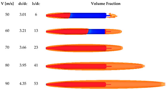 Figure 16 shows the natural cavitation shape as the velocity increases. V is the velocity of inflow, dS is the maximum diameter of the cavitation, dC is the diameter of the cavitator, and lS is the maximum length of the caviation. In the case of a natural cavitation, it can be confirmed that the body speed is completely covered by the cavitation between 70 and 80 m/s. As the speed increased, the maximum diameter of the cavitation increased, and after 70 m/s, the cavitation generated from the front met the cavitation created in the tail, and the maximum length of the cavitation increased significantly. Figure 17 shows the total force of drag divided by the forces for pressure and viscous. The total drag is given by,