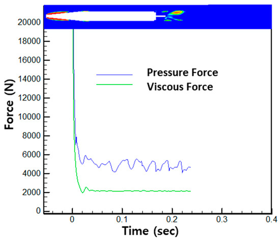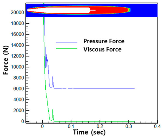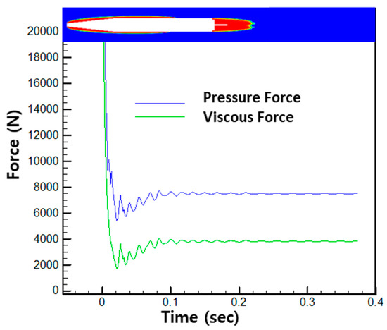 Figure 18 shows the results of the partial cavitation computational analysis with a speed of 50 m/s. The reason for the oscillation of the graph results is that the wetted surface continuously changes due to the partial cavitation, which is the result of the unsteady state analysis. The oscillation is more severe due to the cavitation shape falling off of the tail. Figure 19 is the result of the computational analysis of 70 m/s. This is the result of the computational analysis of the transition point from the partial cavitation to the supercavitation. Although not yet complete supercavitation, it can be seen that the viscous force is reduced compared to Figure 18 because it is close to the supercavitation state. Figure 20 shows the force in a complete super cavitation as a result of the computational analysis of 90 m/s. As the speed increases, the pressure force is increased by the exposed head, but it can be seen that the viscous force is completely removed due to the complete supercavitation. By the relationship between the supercavitation and the viscous force, the supercavitation contributes to lowering the level of the total force.