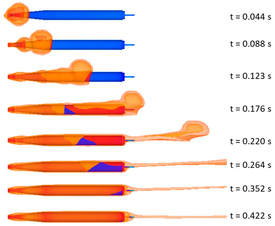 In the case of a natural cavitation, a velocity condition higher than a certain value is required to achieve a super cavitation. However, if the injection cavitation is used as in Section 4.2, a super cavitation can be achieved even at low-speed conditions. The velocity condition in Figure 21 is 30 m/s. It can be seen from the results of Figure 16 that the supercavitation cannot be reached when the velocity condition is 30 m/s. However, the artificially injected cavitation in front of the body makes this possible. It can be seen that the gas injected from the front of the body forms a cavitation and covers the entire body in a very short time. The injected gas is a non-condensing gas, which is transmitted to the rear, and it can be seen that the rear end cavitation rises upward due to the buoyancy effect in the low-speed condition. This is a physically valid result even when compared with the results in Figure 5, Figure 6 and Figure 7. However, because the body itself is low in speed, even if the super cavitation is achieved, the problem is that the maximum diameter of the cavitation is small and the tail cavitation is short compared to the super cavitation shape of 80 m/s or more in Figure 16. However, since the injection cavitation can achieve super cavitation even at low-speed conditions, it is expected that it can be used to assist and maintain the formation of the initial super cavitation in the design of the super-high-speed underwater vehicle.