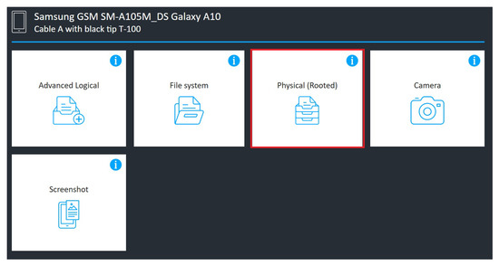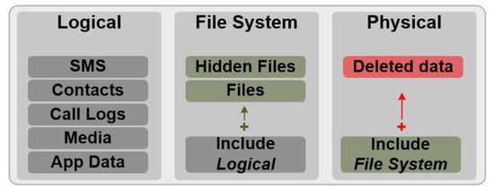 - Khan, A.; Mansuri, Z.H. Comparative study of various digital forensics logical acquisition tools for Android smartphone’s internal memory: A case study of Samsung Galaxy S5 and S6. Int. J. Adv. Res. Comput. Sci. 2018, 9, 357–369. [Google Scholar] [CrossRef][Green Version]