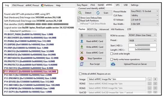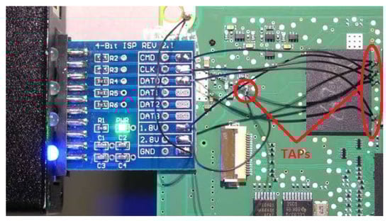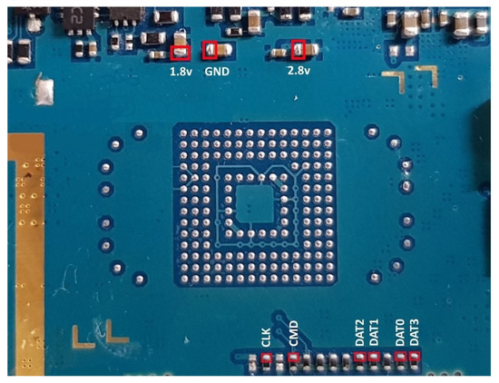 For the ISP technique, during the acquisition process, the contents of the internal memory are copied without removing the chip. To the best of the authors’ knowledge, to date, ISP acquisition is only available for devices that use flash memory as Embedded Multimedia Card (eMMC) or Embedded Multi-Chip Package (eMCP) with Ball Grid Array (BGA) encapsulation type.