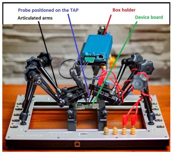 It is also possible to make use of an interface called VR-TABLE, which has articulated arms, equipped with high-precision metal probes, which dispense the welding of the conductors on the mobile device board, eliminating the possibility of damage caused by overheating. Figure 5 demonstrates the use of a VR-Table.