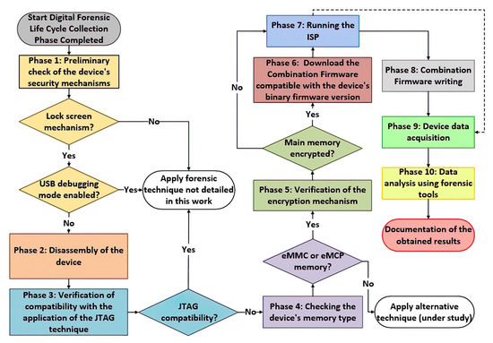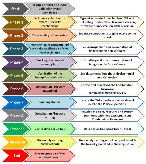 According to Afonin and Katalov [24], The forensic analysis using the ISP technique is a less invasive or destructive variation than the Chip-Off technique. The ISP technique involves an advanced acquisition process between the Joint Test Action Group (JTAG) and the Chip-Off.