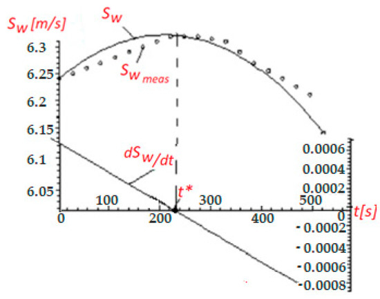 The approximated wind speed reaches a maximum value for the time instant (see Figure 1), obtained by canceling its derivative in Equation (45), , whose solution is (s).