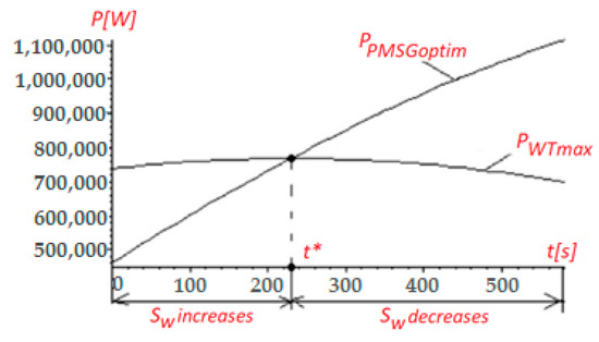 Therefore, in order to capture the maximum wind energy, the wind turbine should be controlled to operate at the PMSG’s optimal angular speed, imposed by the wind speed value. This condition is checked periodically, and if there are large differences between the PMSG’s angular speed and its optimal value, the wind turbine is brought into the MPP operation by inserting the necessary amount of electric energy, provided by the national power system. If the value of the wind speed is decreasing, its derivate becomes negative, and the PMSG’s power becomes greater than the wind turbine’s power, while in the case of the wind speed increasing, its derivative becomes positive, and the PMSG’s power becomes lower than that of the wind turbine’s power value.